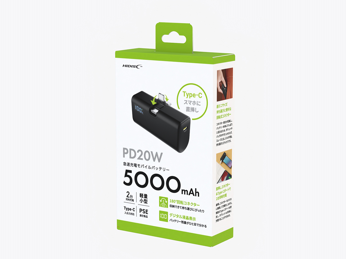 | 製品型番 | HIDISC 180°回転コネクタ直挿し Type-C 5000mAh モバイルバッテリー PD20W対応 |