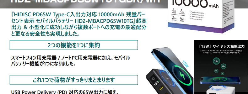 関連ページ: HIDISC M … 続きを読む HIDISC PD65W Type-C入出力対応 10000mAh 残量パーセント表示 モバイルバッテリー