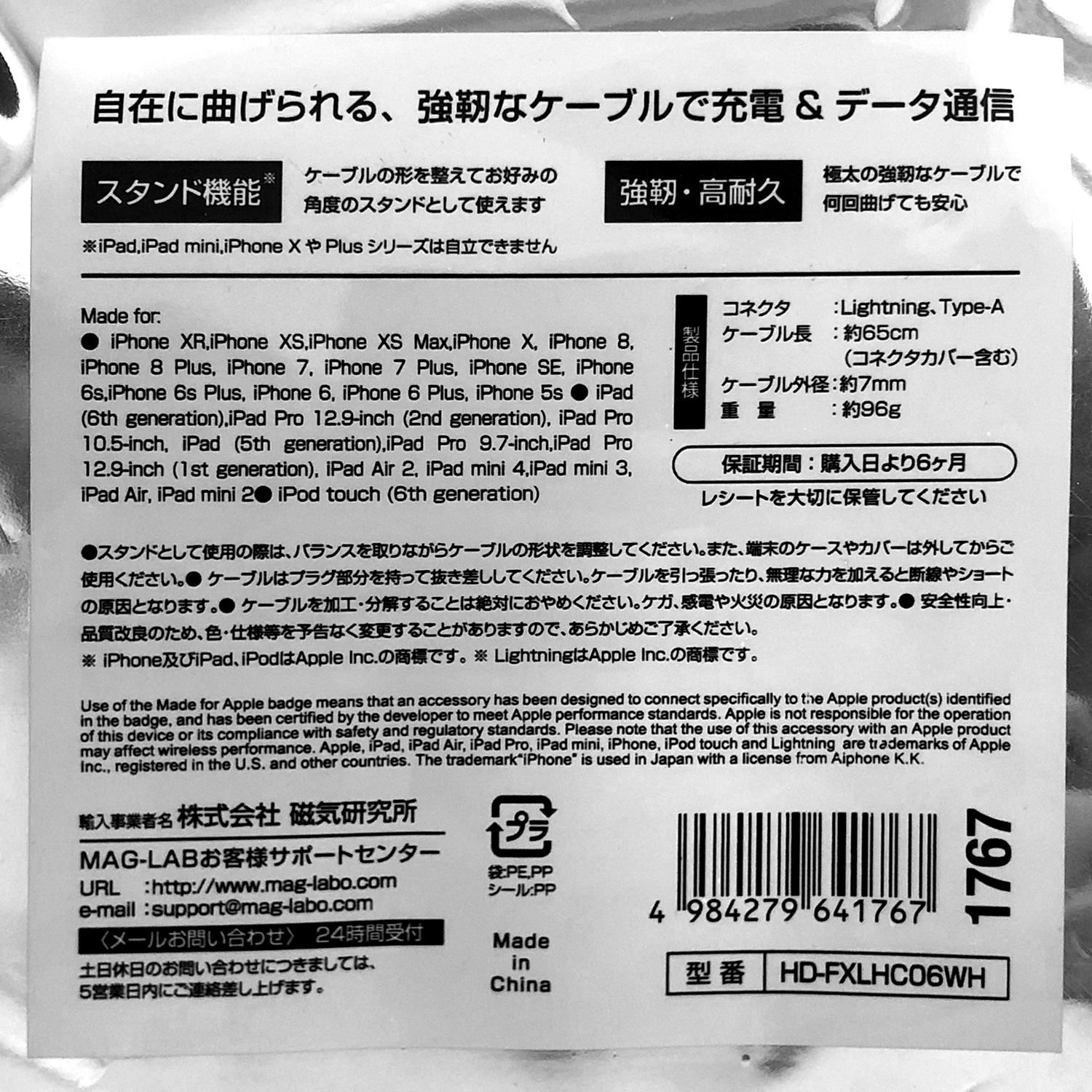Lightningケーブル ケーブル フレキシブル ホワイト 自在に曲げられる、強靭なケーブルで充電&データ通信 HIDISC フレキシブルLightningケーブル 65cm ホワイト 高速充電2.4A対応 断線しにくい HD-FXLHC06WH 商品詳細 型番 HD-FXLHC06WH JANコード 4984279641767 用途 充電とデータ転送用 高速充電2.4A対応 対応OS iPhoneXR/XS//XS MAX/X/8/8Plus/7/7Plus/6S/6S Plus/6/6 Plus/5S/5C/5,iPad Air/Air2,iPad mini/mini2/mini3等 カラー ホワイト ケーブル長 65cm 重量 96g 保証期間 保証期間6ヶ月 オンラインストアで購入 関連ページ: 【Apple認証品】HIDISC Lightningケーブル 1m ホワイト 高速充電2.4A対応 断線しにくい HDⅡ-LHC1WH 【Apple認証品】HIDISC 1本で3役 Lightning, microUSB, Type-Cケーブル 1m ホワイト高速充電2.4A対応 HD-3IN1WH 【Apple認証品】10000回の折り曲げに耐えられるしなやかLightningケーブル 1m アルミコネクタ/ナイロンメッシュ 高速充電2.4A対応 HD-LHC1SWH HIDISC L字型 Lightning 充電/通信ケーブル 1m HD-LHCL1WH