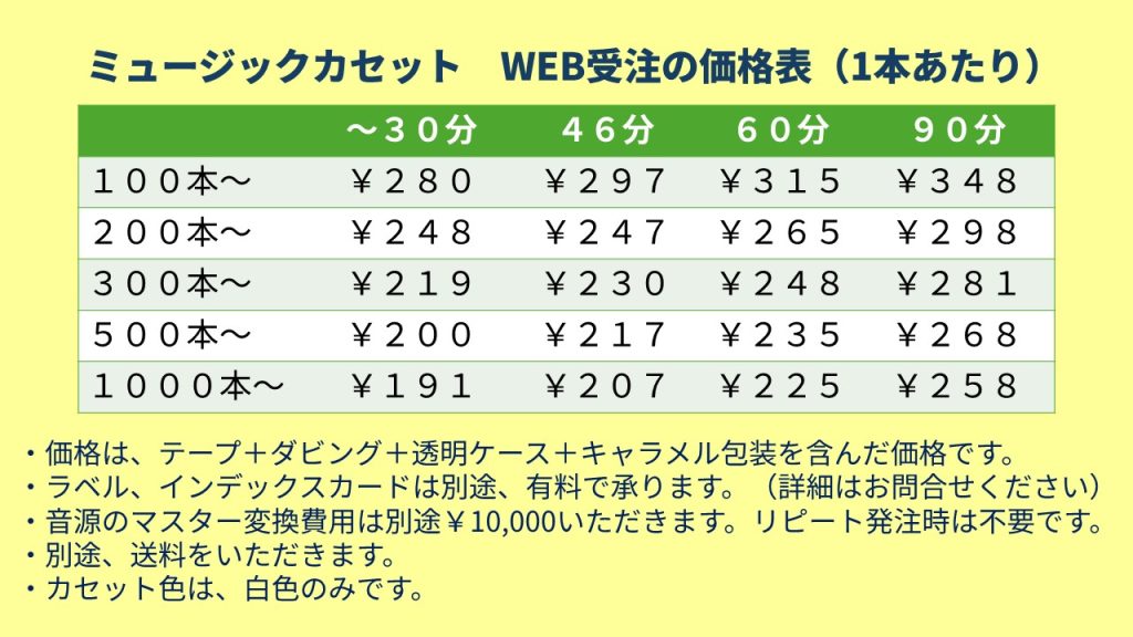 デュプリケーション ミュージックカセットテープ製作 You need to add a widget, row, or prebuilt layout before you’ll see anything here. 🙂 関連ページ: デュプリケーションサービス デュプリケーション(コピー/プレスサービス) CD/DVD/BDプレスサービス ダビングサービス