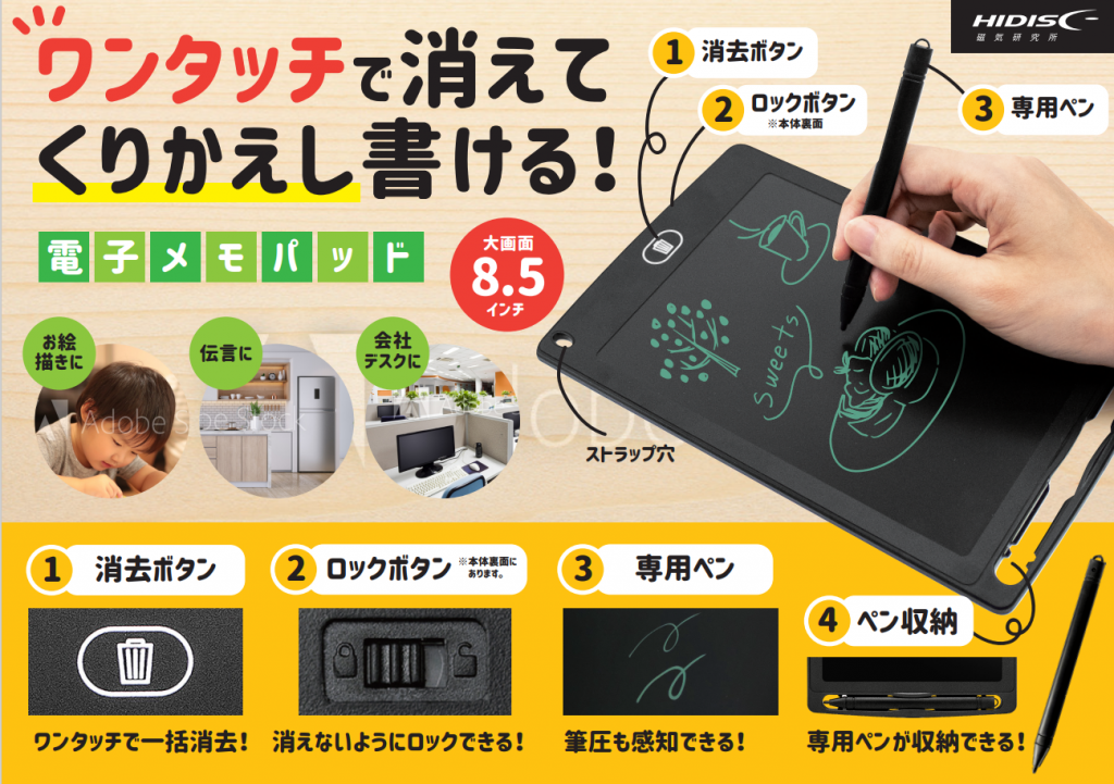 文房具 ワンタッチで消えて繰り返し書ける! HIDISC 電子メモパッド オンラインストアで購入 関連ページ: HIDISC 8.5インチ電子メモパッド HDMPAD85BK HIDISC セキュリティシール100シート HIDISC 4.4インチ電子メモパッド HDMPAD44BK HIDISC 6インチ電子メモパッド HDMPAD60BK-RX