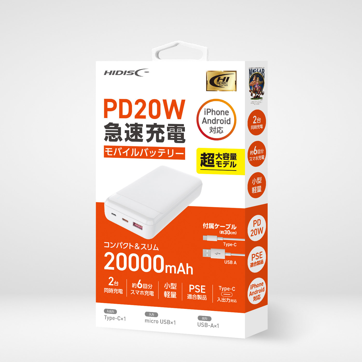 | 商品名 | HIDISC PD20W, QC3.0対応 20000mAhモバイルバッテリー ホワイト |
