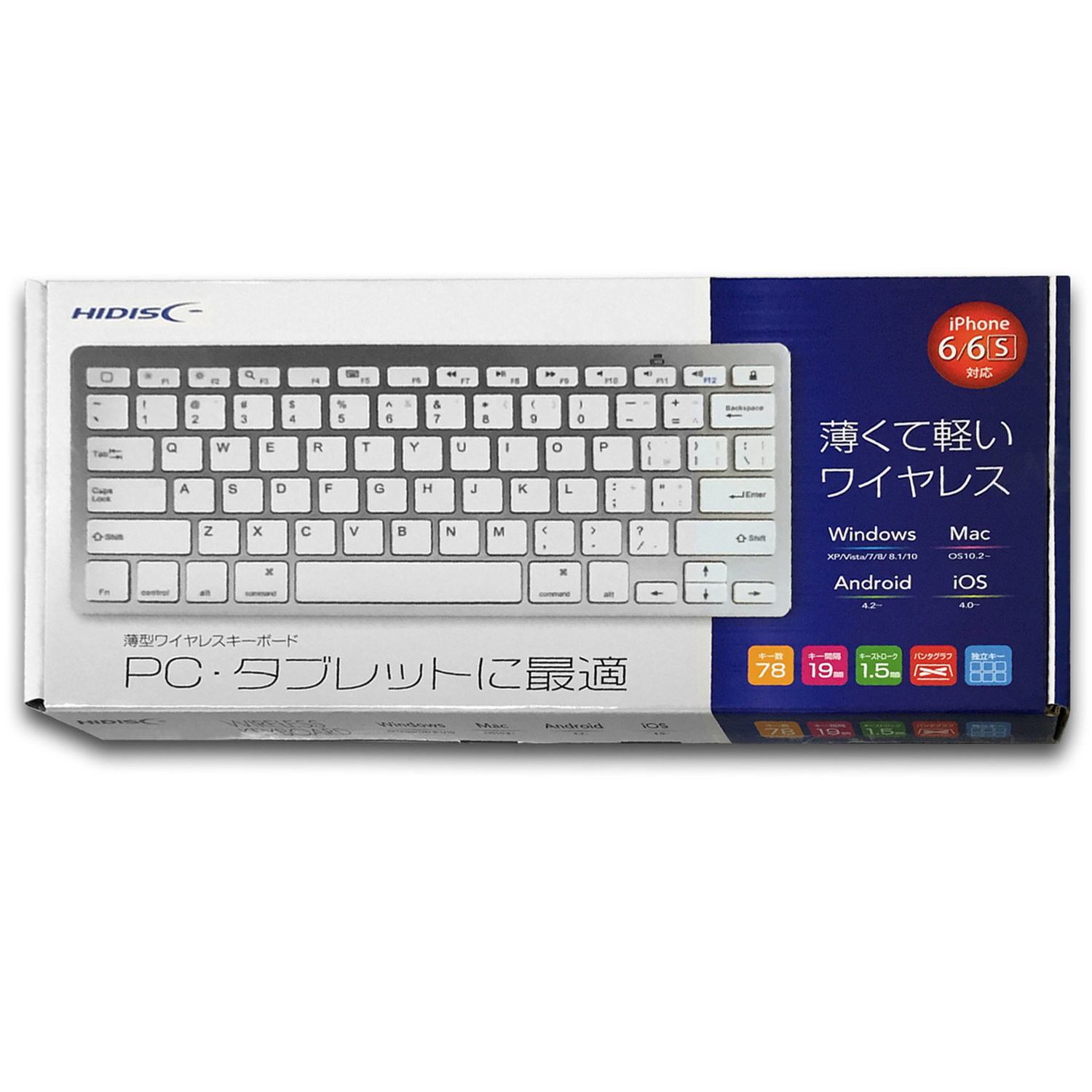キーボード ワイヤレスキーボード 薄型ワイヤレスキーボート Bluetooth3.0 Windows/Android/iOS対応 商品詳細 型番 HD-K263BSV JANコード 4984279550021 規格 Bluetooth3.0 用途 PC/タブレット用 対応OS iOS4.0以上/Android4.2以上/MacOS10.2以上/Windows XP/7/8/8.1/10 サイズ 285×120×20mm 重量 約310g(乾電池は付属しておりません) 備考 付属品:本体、取扱説明書(保証書) メーカー保証 6か月 オンラインストアで購入 関連ページ: HIDISC ワイヤレスキーボード HIDISC スタンダードな、有線テンキーボード (18キー) HDK-1109BK HIDISC ライトニング有線キーボード HD-AK8PINWH HIDISC スケルトン LEDキーボード HDGMKB106WBK