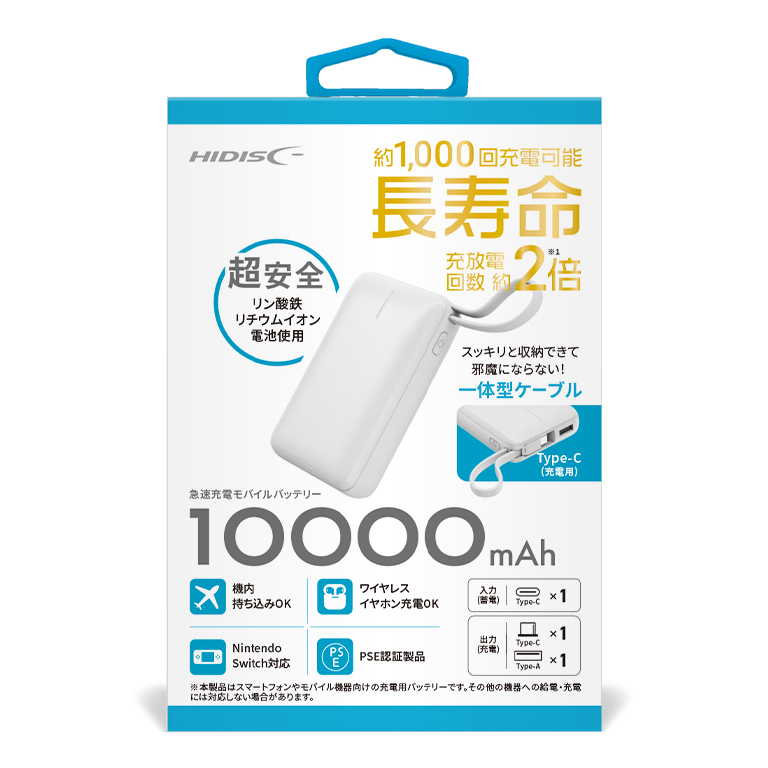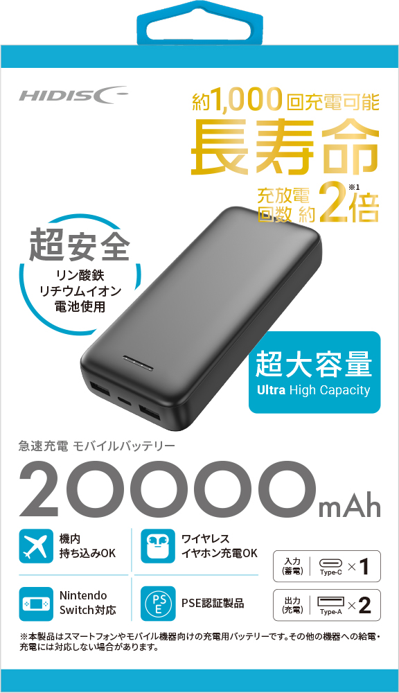 | 商品名 | HIDISC リン酸鉄リチウムイオン電池使用 急速充電モバイルバッテリー 20000mAh ブラック |
