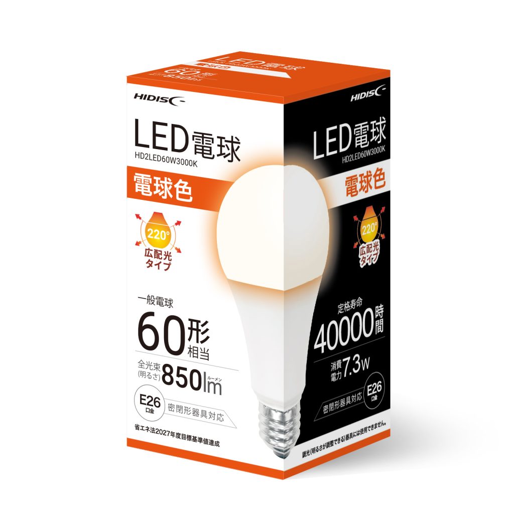 E26 LED照明・電球 LED製品 一般電球60形相当 HIDISC LED電球(一般電球60形相当) 昼白色 HD2LED60W5000K 商品名HIDISC LED電球(一般電球60形相当) 昼白色型番HD2LED60W5000KJANコード4984279820629 全光束 (ランプ単体の明るさ)一般電球60形相当 ≥810㏐電圧90-110V色温6500K外径60mm長さ110mm質量43g温度範囲約-20-40度定格寿命40000h口金E26配光角220°認証PSE認証品・密閉形器具対応材質アルミ、ポリカーボネート、PA オンラインストアで購入 関連ページ: HIDISC LED電球(一般電球60形相当) 昼光色 HD2LED60W6500K HIDISC LED電球(一般電球60形相当) 電球色 HD2LED60W3000K HIDISC LED電球(一般電球40形相当) 昼光色 HD2LED40W6500K HIDISC LED電球(一般電球40形相当) 昼白色 HD2LED40W5000K