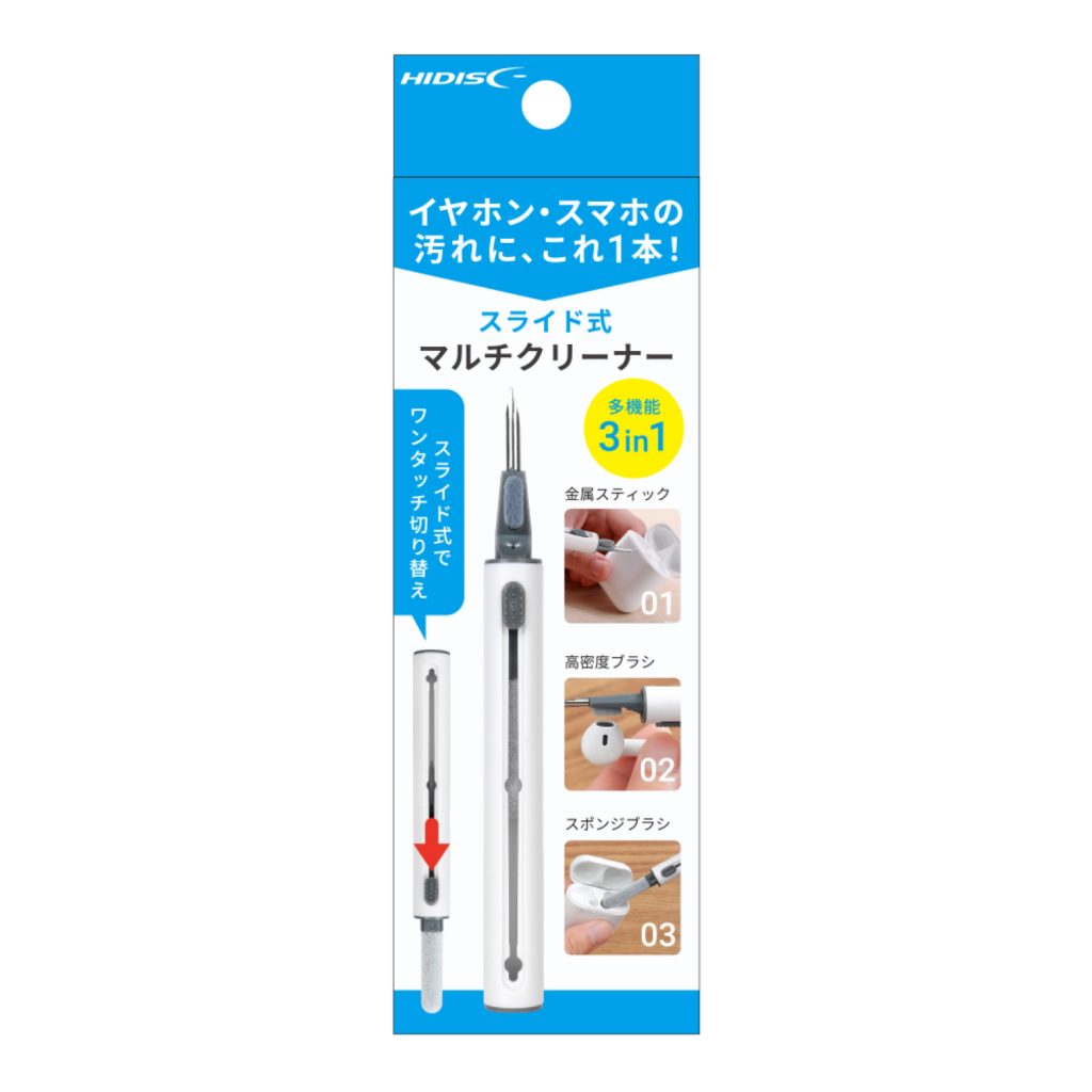 | 特徴 | ●イヤホンやスマホを清潔に保つ、3in1多機能ペン型クリーナーです。 ●金属スティック・高密度ブラシ・スポンジブラシの3種類のツールを搭載し、 スマホやイヤホンの隅々までしっかりお手入れできます。 ●スライド式構造でワンタッチ切り替えが可能です。 |