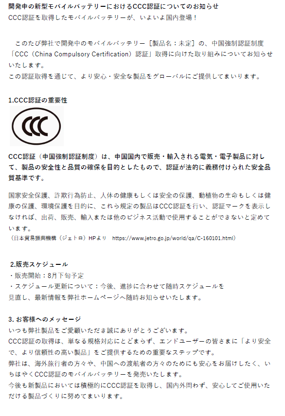 開発中の新型モバイルバッテリーについてのお知らせ